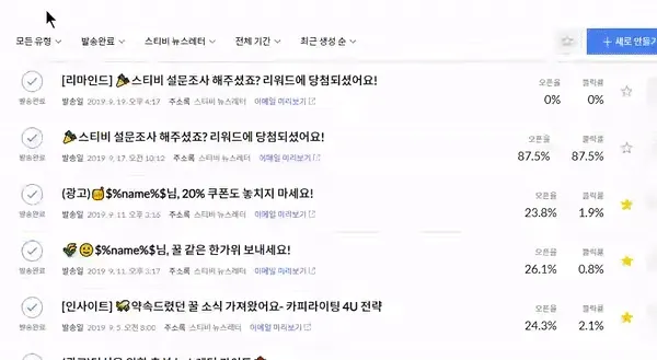 이메일 목록에서 유형, 상태, 주소록을 기준으로 조회하거나, 마지막 업데이트일을 기준으로 기간을 설정하여 조회할 수 있습니다. 중요한 이메일에 "별표" 표시를 한 뒤, 별표 표시된 이메일만 따로 조회할 수 있습니다.