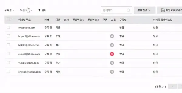 구독자 목록에서 구독자의 상태, 할당된 그룹, 이메일 주소, 그 외 사용자 정의 필드 값으로 필터를 만들어 조회할 수 있습니다. 이메일 주소 외의 다른 사용자 정의 필드 값을 기준으로 검색을 할 수 있습니다.