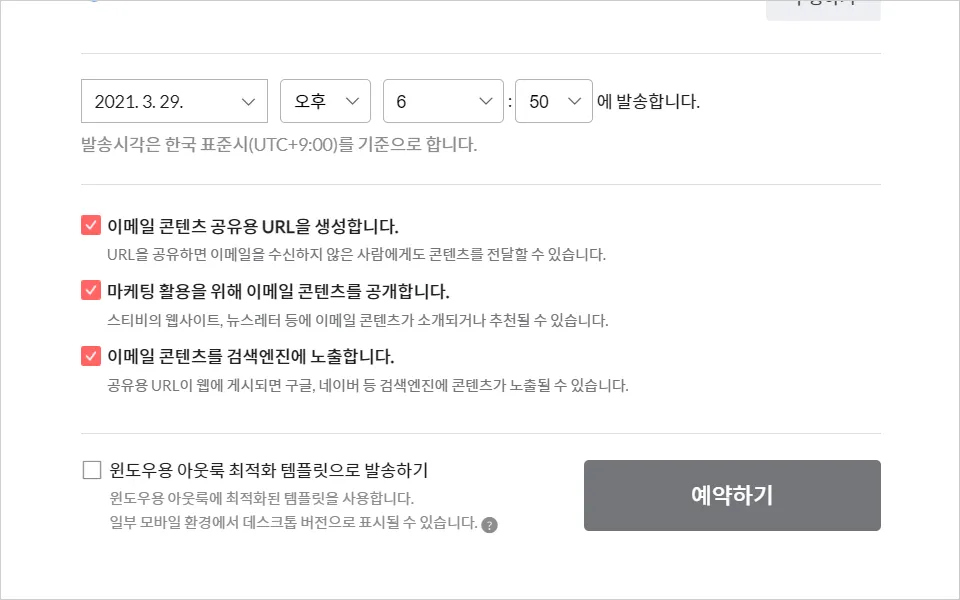 이메일 콘텐츠의 공유용 URL을 생성할지, 마케팅 활용을 위해 이메일 콘텐츠를 공개할지, 이메일 콘텐츠를 검색엔진에 노출할지 설정할 수 있습니다. 이메일 콘텐츠 공유 설정은 이메일을 발송, 예약할 때 할 수 있습니다. 이메일을 발송, 예약한 뒤에는 이메일 목록에서 더보기 메뉴 > 콘텐츠 공유 설정하기를 클릭하면 설정할 수 있습니다.마케팅 활용을 위해 이메일 콘텐츠를 공개하면, 스티비 팀이 운영하는 웹사이트(예.고객사례), 뉴스레터(예.스티비 뉴스레터) 등에 이메일 콘텐츠가 소개하거나 추천해드립니다.