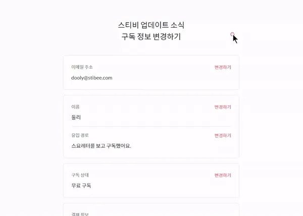 구독자가 자신의 정보를 직접 변경할 수 있는 화면이 추가됐습니다. 구독할 때 입력한 이메일 주소, 이름 등을 구독자가 직접 수정할 수 있습니다. 구독 폼의 구독 확인 메시지나 구독 확인 화면 등의 링크를 통해서 구독자가 구독 정보 변경 화면에 접근할 수 있습니다. 이 화면의 URL을 구독자에게 직접 안내할 수도 있습니다.
