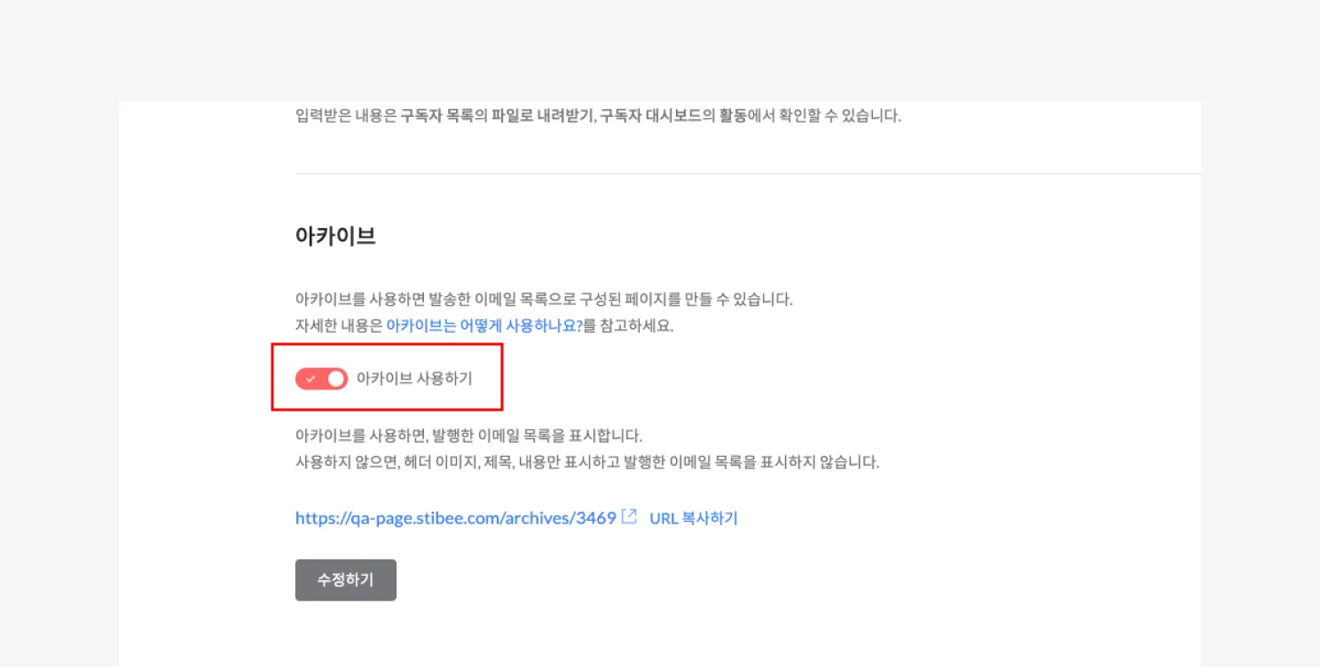 사용하지 않는 아카이브를 비활성화할 수 있습니다. 아카이브를 비활성화하면 헤더 이미지, 제목, 내용만 표시하고 발행한 이메일 목록은 표시하지 않습니다.