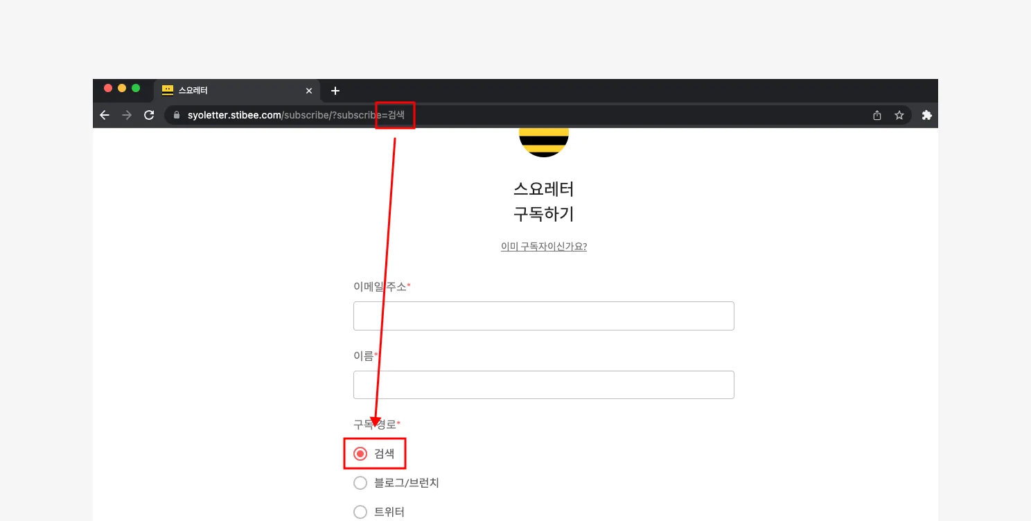 구독 화면(페이지, 구독 폼)의 URL 뒤에 파라미터를 붙여 구독 정보를 자동으로 입력받을 수 있습니다. 예를 들어, ‘syoletter.stibee.com/?subscribe=검색’으로 스요레터 페이지에 접속하면 [구독 경로]가 자동으로 [검색]으로 선택됩니다. 구독 화면에 표시하지 않는 필드를 파리미터로 입력하면, 구독 화면에 값을 노출하지 않고 구독 정보로 입력받을 수 있습니다. 추천인 정보를 간편하게 입력받거나 UTM 파라미터를 구독 정보에 저장하는 등의 목적으로 활용할 수 있습니다.