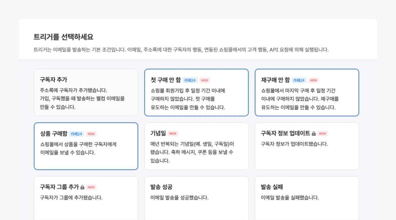 자동 이메일에 새로운 트리거가 추가됐습니다. 카페24 연동을 하신 경우, 쇼핑몰 고객의 구매 시점에 맞춰 이메일을 자동 발송할 수 있습니다.