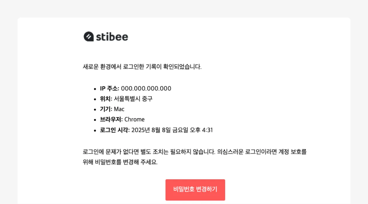 내 계정을 더 안심하고 사용할 수 있도록, 의심스러운 로그인이 감지되면 즉시 안내 이메일이 발송됩니다. 최근에 새로운 디바이스, 브라우저에서 스티비에 로그인해 보셨다면 이런 이메일을 받아보셨을 거에요.