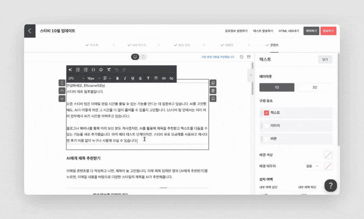 이메일 콘텐츠를 다 작성하고 나면, 제목이 늘 고민됩니다. 이제 제목 입력란 옆의 [AI에게 추천받기]를 누르면, 이메일 내용을 바탕으로 다양한 스타일의 제목을 AI가 추천해줍니다.