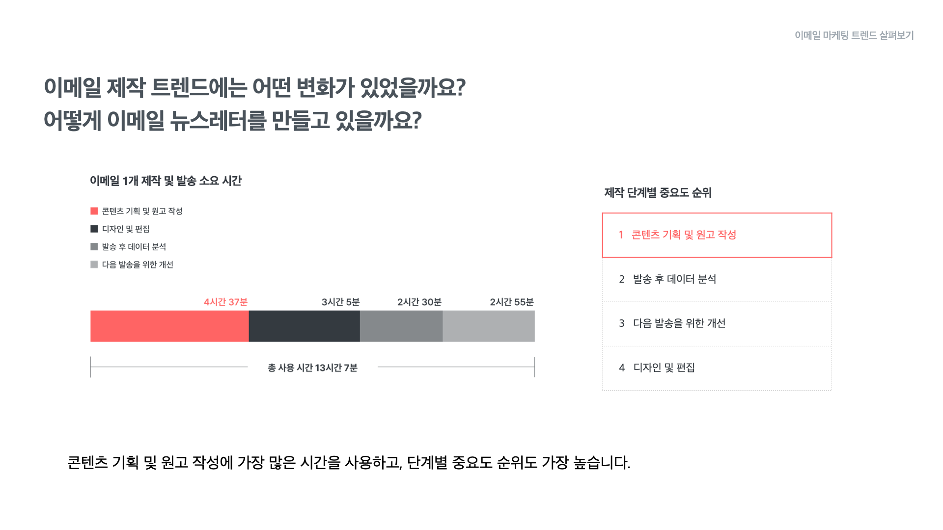 전체 과정 중에서 가장 많은 시간을 들이는 단계는 ‘콘텐츠 기획 및 원고 작성’으로 평균 4시간 37분이 쓰이고 있습니다. 그 뒤를 이어 디자인 및 편집이 3시간 5분, 발송 후 데이터 분석이 2시간 30분, 다음 발송을 위한 개선 작업이 2시간 55분 소요된다고 응답했습니다.