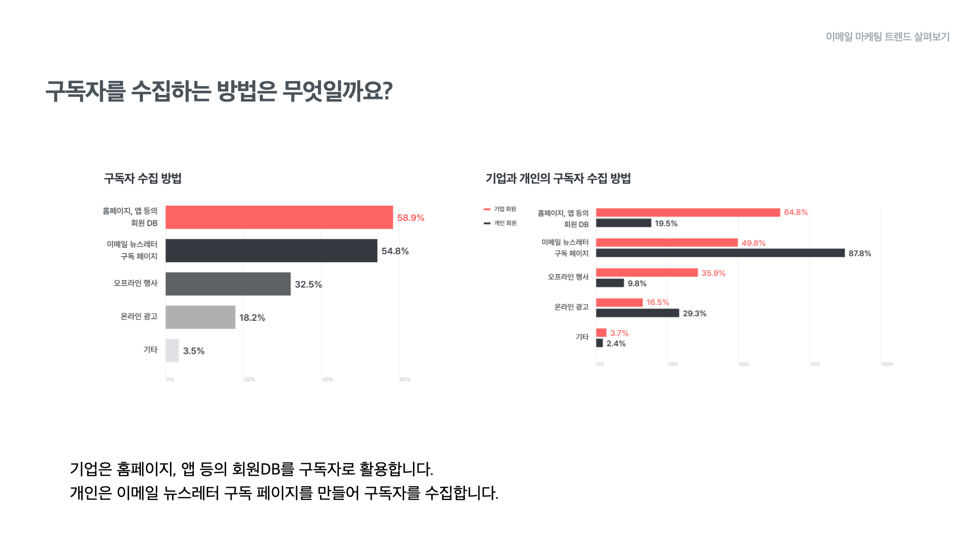 오른쪽 그래프는 구독자 수집 방법을 회원 구분따라 비교한 것인데요. 기업 회원은 ‘홈페이지/앱 등의 회원 DB’ 활용 비율이 64.8%로 가장 높았습니다. 한편 개인 회원은 ‘뉴스레터 구독 페이지’를 통해 구독자를 모으는 비율이 87.8%로 가장 높았습니다. 구독자가 뉴스레터의 주제나 콘텐츠에 큰 관심을 가지고 자발적으로 구독을 신청한 경우가 많다는 뜻입니다. 즉, 개인은 콘텐츠를 활용한 자발적 구독 전략을, 기업은 기존 고객을 구독자로 활용하는 전략을 취하고 있는 것으로 보입니다.