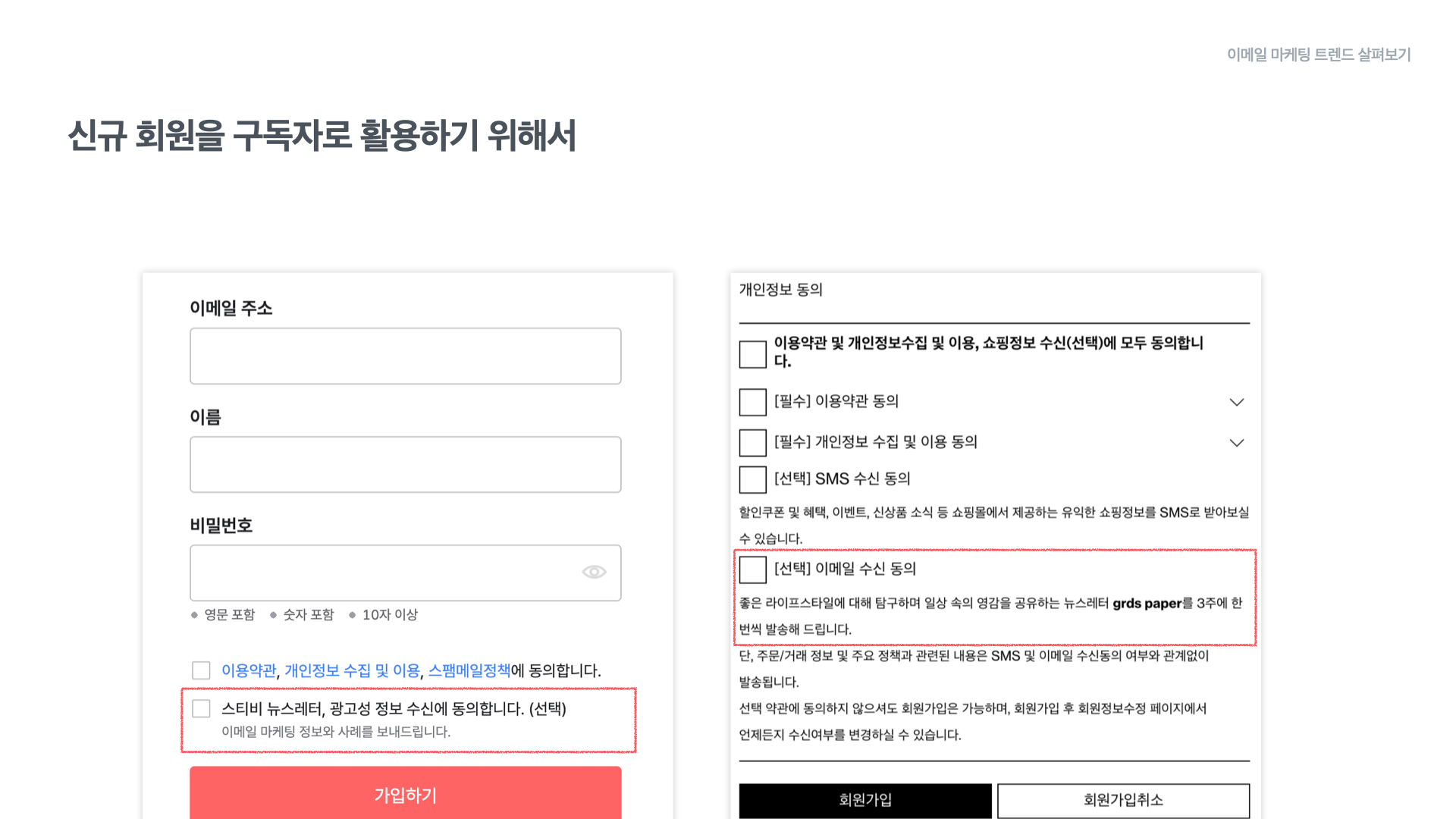 왼쪽의 이미지는 스티비의 사례로. 회원가입 단계에서 ‘이메일 마케팅 정보와 사례를 보내드린다’는 내용을 노출하고 있습니다. 오른쪽의 이미지인 슈즈 브랜드 grds의 경우에는 ‘일상 속의 영감을 공유하는 grds paper를 3주에 한 번 보내드린다’고 안내하고 있습니다. 이런 안내를 본 신규 회원은 내가 받는 이메일이 단순한 광고가 아니라 나에게 도움이 되는 콘텐츠라는 점을 기대할 수 있게 됩니다.