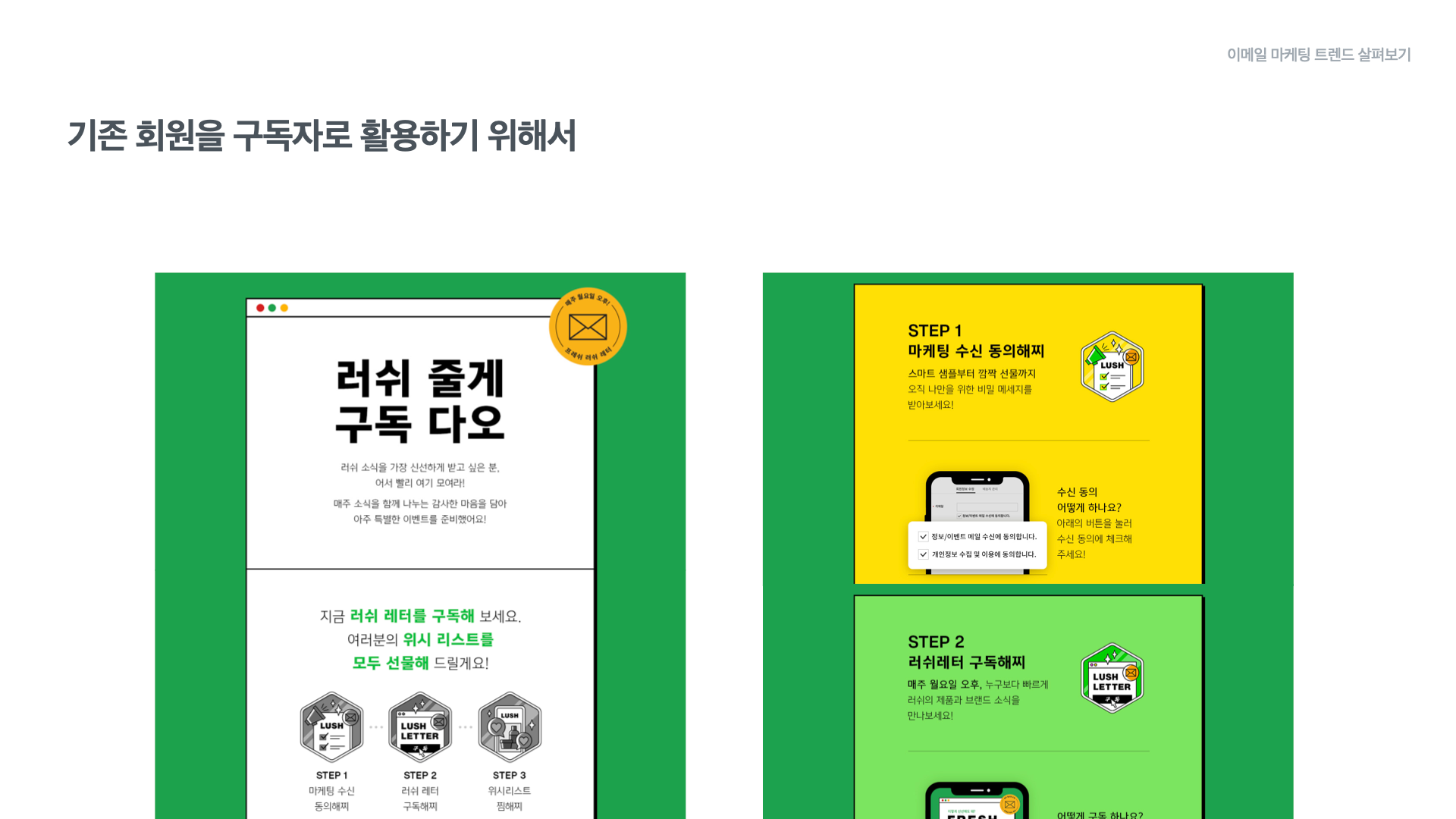 만약 기존 회원을 대상으로 이메일 뉴스레터를 발송하고 싶은데, 이전에 광고성 정보 수신 동의를 받아 두지 않았다면 러쉬의 사례를 참고할 수 있습니다.
