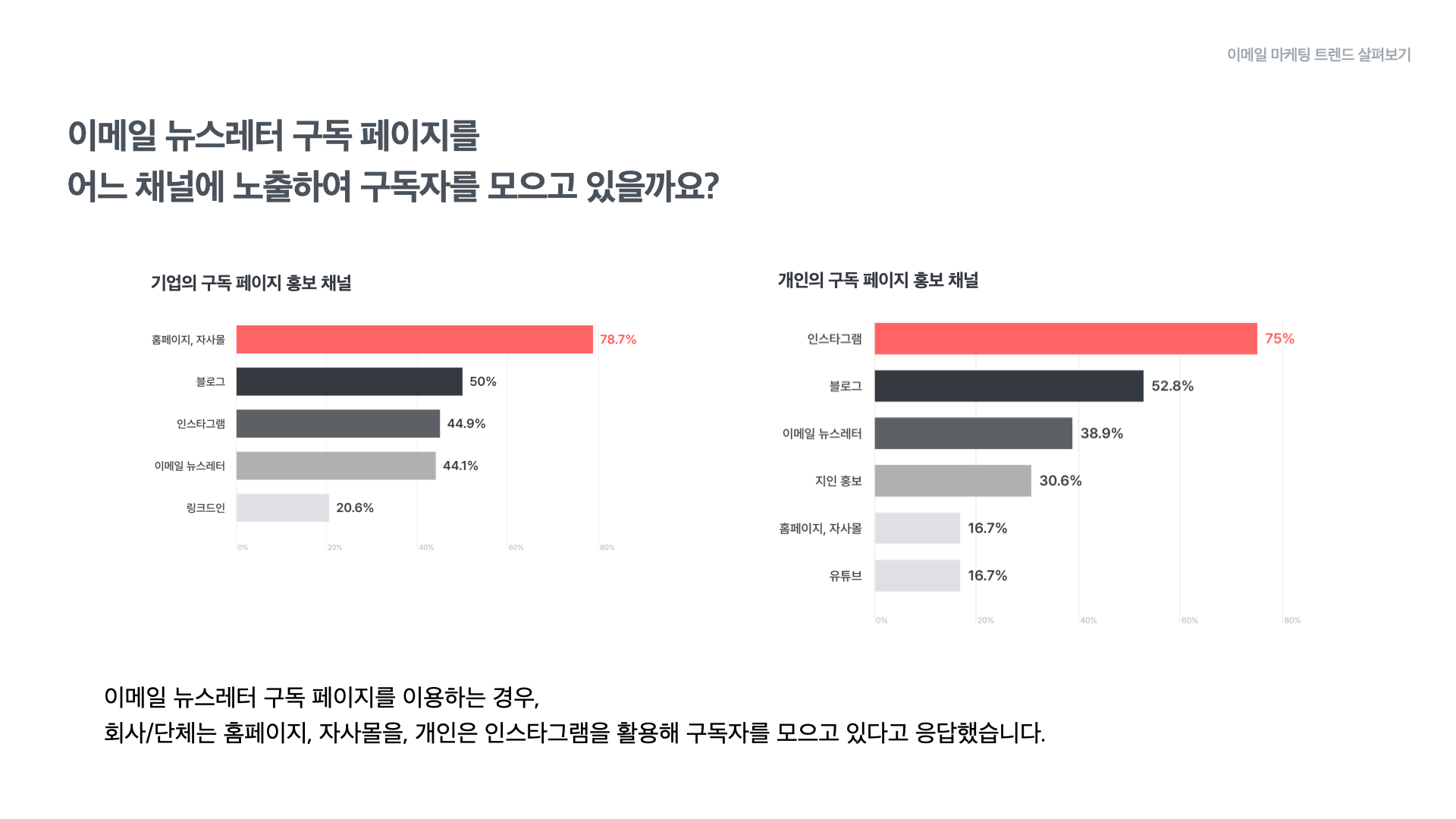 구독 페이지를 어떤 채널에 홍보하고 있는지에 대한 질문에 기업 회원은 78.7%가 홈페이지와 자사몰을 활용하고 있다고 답했고, 블로그가 50%로 두 번째였습니다. 개인 회원의 경우에는 인스타그램이 75%로 가장 높았고 블로그가 52.8%로 뒤를 이었습니다.