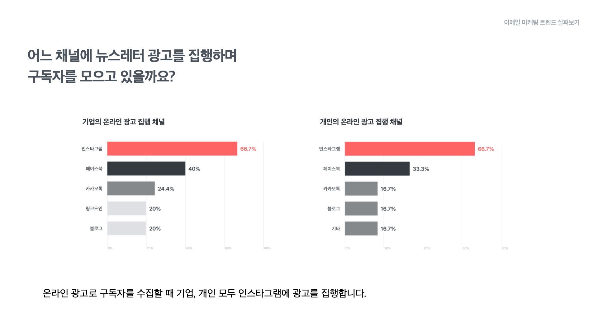 기존에 접점이 없었지만, 우리 뉴스레터를 좋아할만한 사람들을 만나기 위해 온라인 광고를 집행하는 경우도 있습니다. 이때 기업과 개인 회원 모두 66.7%로 인스타그램 중심의 광고를 집행하고 있었습니다.