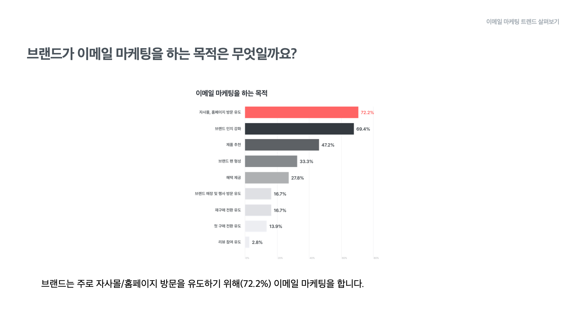 72.2%가 자사몰 및 홈페이지 방문 유도를 위해 이메일 마케팅을 하고 있습니다. 브랜드 인지 강화가 69.4%, 제품 추천이 47.2%, 브랜드 팬 형성이 33.3%로 뒤를 이었습니다.