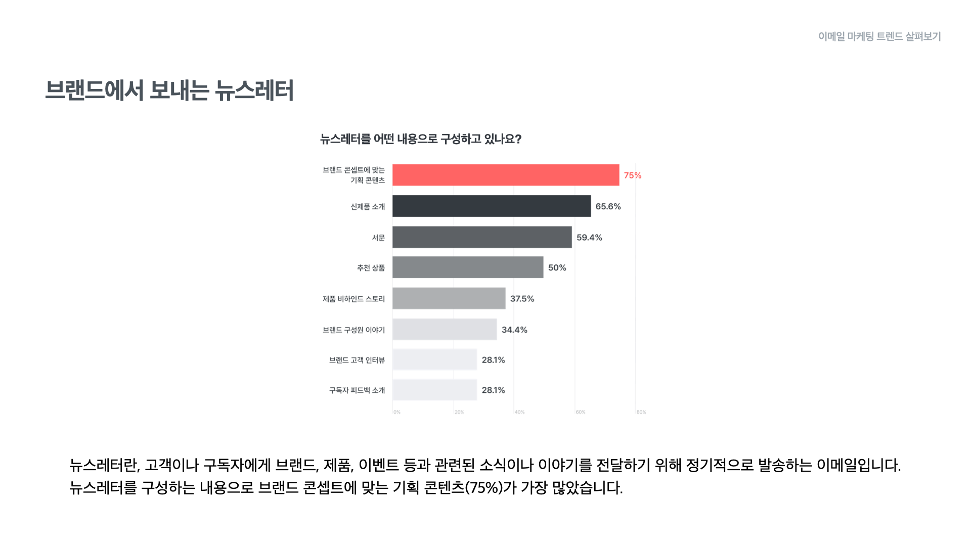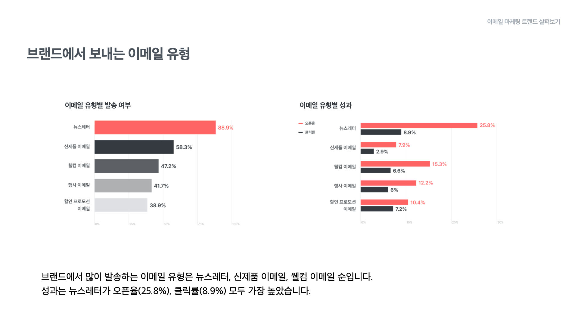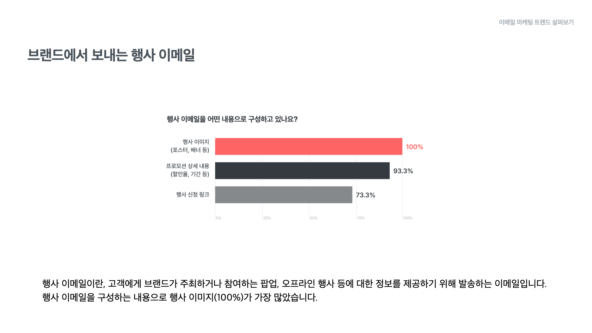 이어서 각 이메일 유형별로 어떤 내용으로 이루어지는지에 대한 구성 현황과 브랜드의 발행 경험에 대해 살펴보겠습니다.