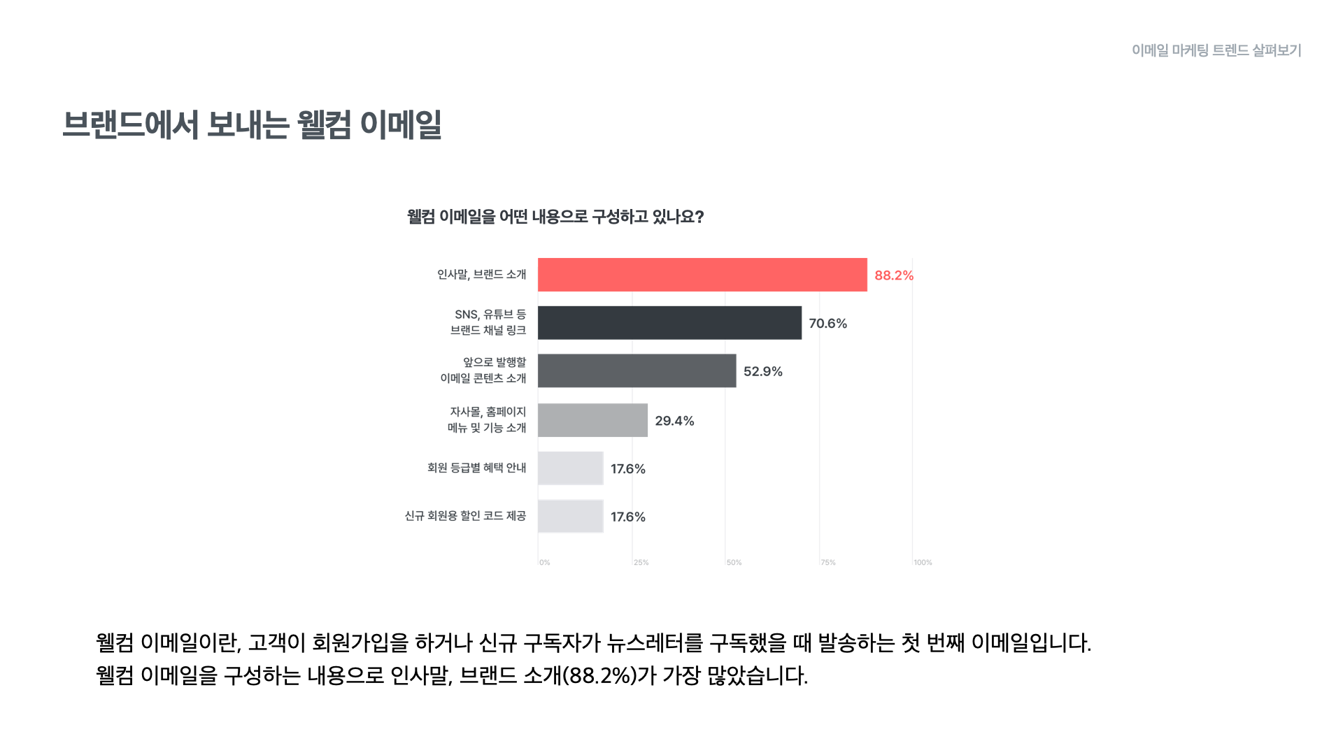 웰컴 이메일을 구성하는 내용으로는 인사말, 브랜드 소개가 88.2%, SNS, 유튜브 등 브랜드 채널 링크가 70.6%, 앞으로 발행할 이메일 콘텐츠 소개가 52.9%였습니다.