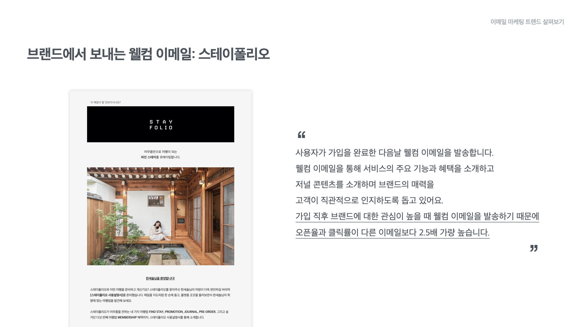 스테이 큐레이션 플랫폼 ‘스테이폴리오’는 사용자가 가입을 완료한 다음 날 웰컴 이메일을 발송하고 있습니다. 서비스의 주요 기능과 혜택 그리고 브랜드의 매력을 담은 저널 콘텐츠를 담아 전달하는데요. 가입 직후 브랜드에 대한 관심이 가장 높을 때 웰컴 이메일을 발송하기 때문에 일반 정기 발송 이메일보다 웰컴 이메일의 오픈과 클릭 성과가 2.5배 가량 높다고 합니다.