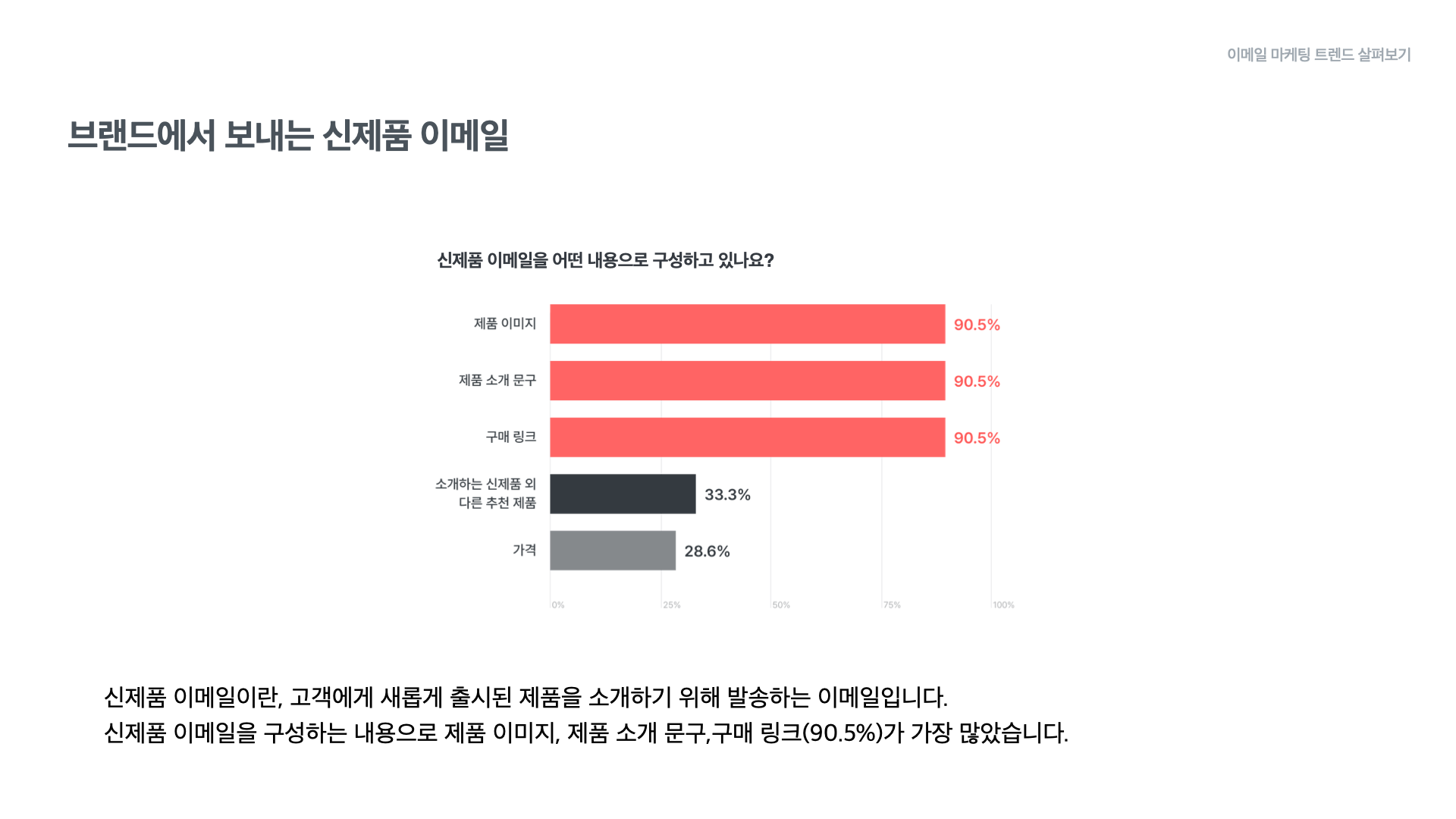 신제품 이메일을 구성하는 내용으로는 제품 이미지, 제품 소개 문구, 구매 링크가 각각 90.5%로 가장 많았습니다. 제품에 대한 시각적 정보, 제품 소개와 더불어 구매로 이어질 수 있는 CTA 요소가 적절히 사용되고 있는 것으로 보입니다.