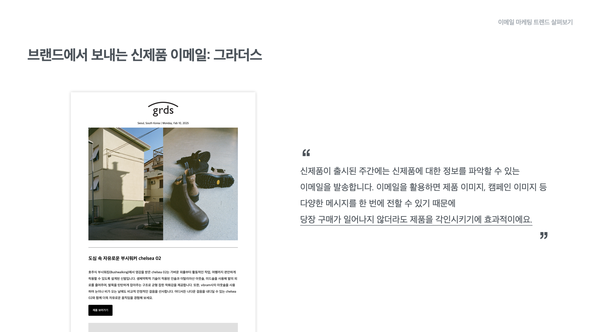 슈즈 브랜드 ‘grds’는 신제품이 출시된 주간에 신제품에 대한 정보를 소개하는 이메일을 발송합니다. 이메일에 제품 사진과 소개, CTA 버튼 등을 적절히 사용하고 풍성한 메시지를 담고 있기 때문에 당장의 구매 전환이 아니더라도 우리 브랜드의 제품을 각인시킬 수 있다고 합니다.