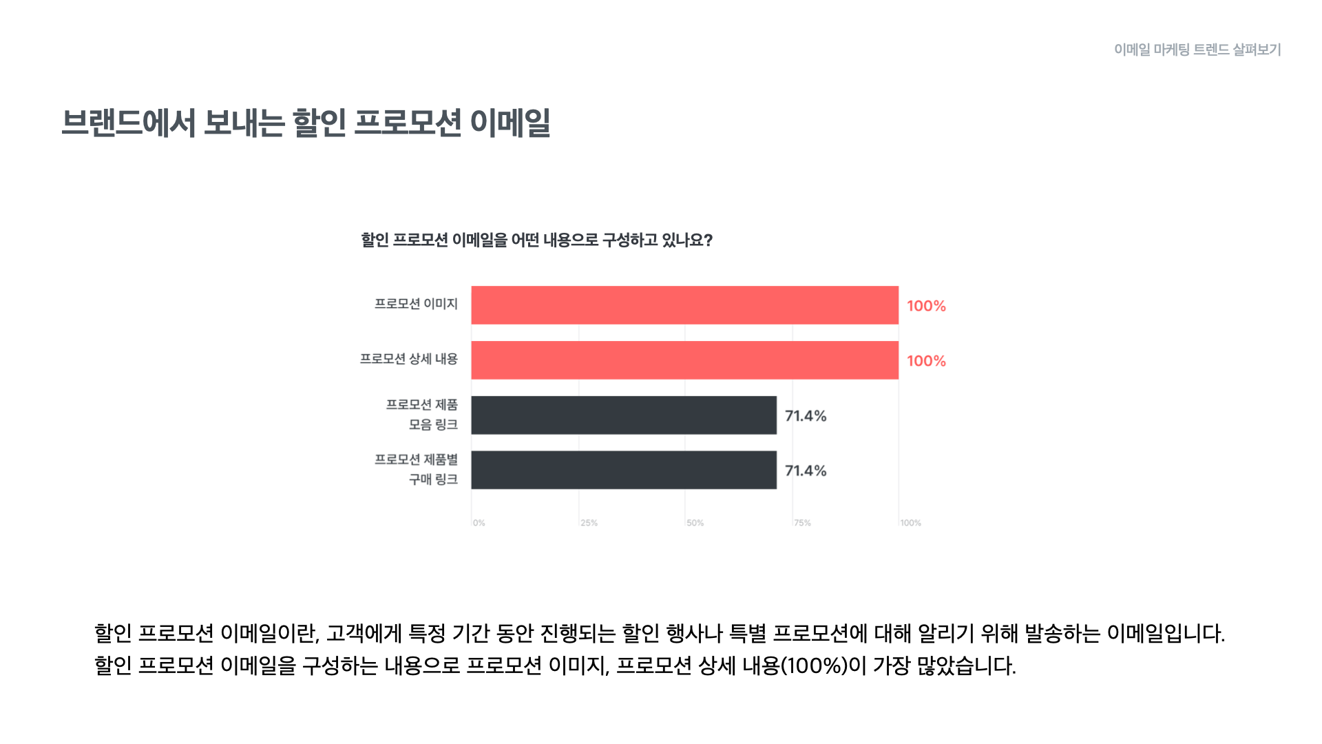 설문을 진행했을 때 모든 응답자가 할인 프로모션 이메일에 프로모션 이미지와 상세 내용을 포함한다고 응답했는데요. 프로모션 성격과 내용을 알리기 위해 필수적인 내용이기 때문으로 보입니다.