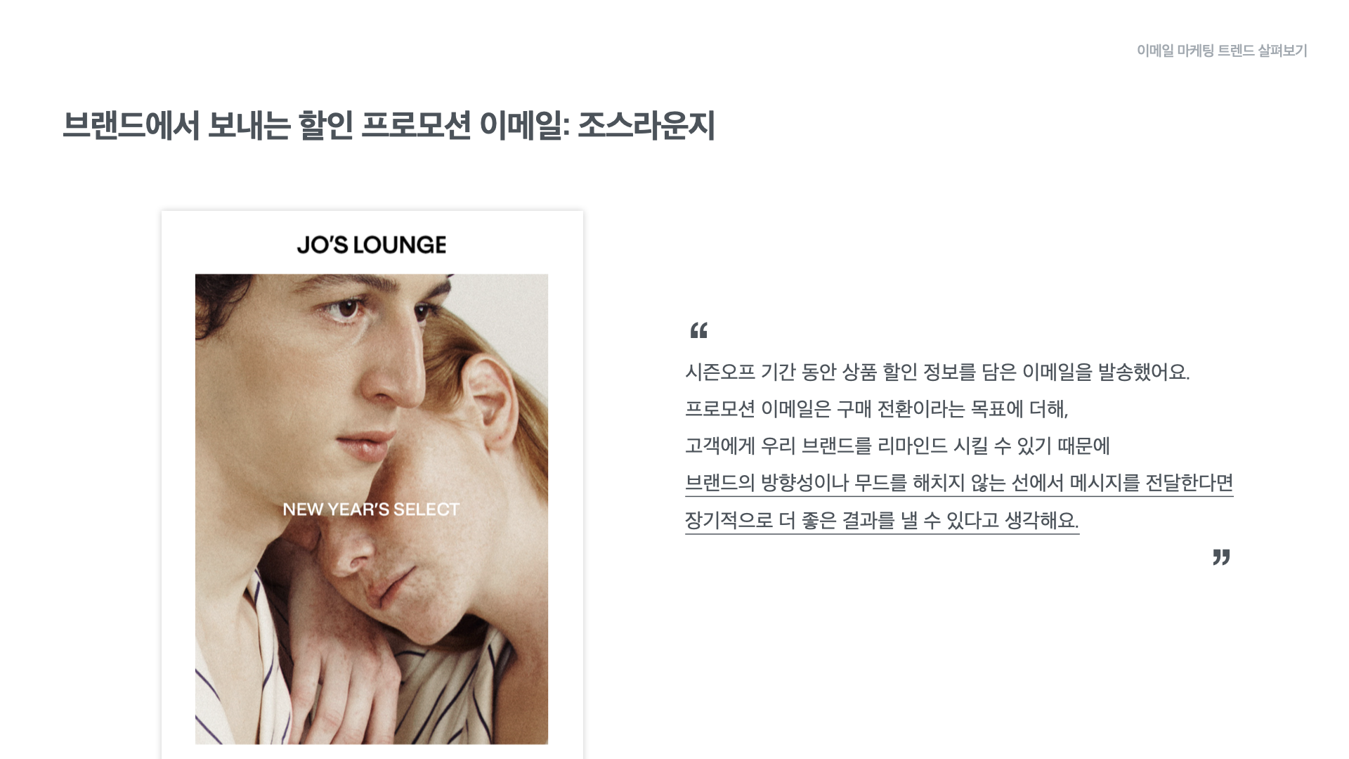 파자마 브랜드 ‘조스라운지’는 시즌오프 기간에 상품의 할인 정보를 담은 프로모션 이메일을 발송합니다. 조스라운지는 단순히 할인만을 크게 외치는 것이 아니라 브랜드의 비전과 톤앤매너를 반영하여 프로모션 이메일을 구성합니다. 덕분에 구매 전환이라는 목표를 달성할 수 있고 또 브랜드를 리마인드 하여 장기적으로도 브랜드에 더 좋은 영향을 줄 수 있다고 말했습니다.