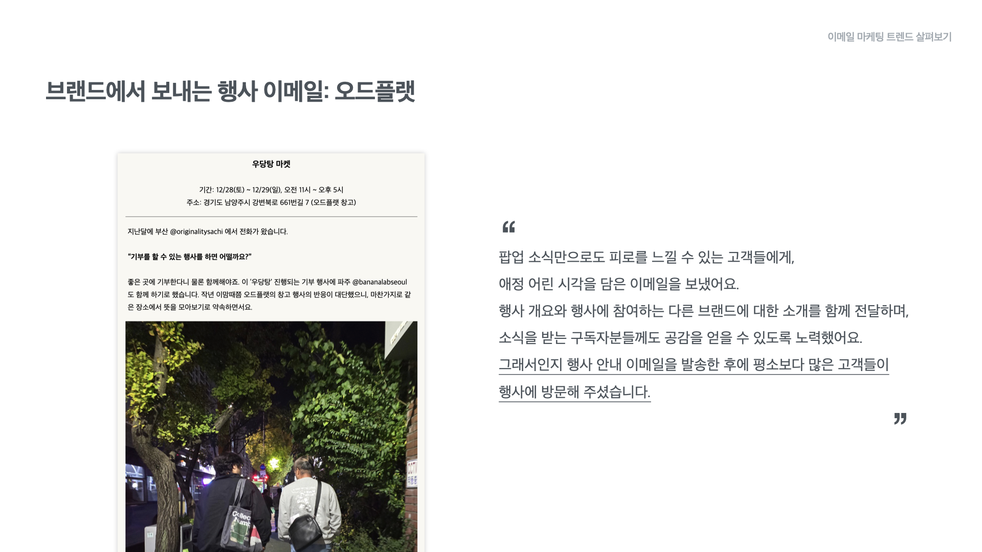 빈티지 가구 편집숍 오드플랫은 오프라인 공간에서 행사를 진행할 때 행사 이메일을 발송합니다. 최근 다양한 브랜드에서 팝업 소식을 전하고 있는데요. 오드플랫은 구독자가 행사 소식에 대해 피로감을 느낄 수 있다는 점을 고려해 행사 이메일을 포스터로만 구성하는 것이 아니라 행사 개요와 참여 브랜드의 소개를 담았습니다. 소식을 받는 분들에게 충분한 정보를 전달하며 공감을 얻을 수 있도록 노력한 것인데요. 덕분에 행사 안내 이메일을 발송한 뒤, 평소보다 더 많은 고객과 행사장에서 만날 수 있었다고 합니다.
