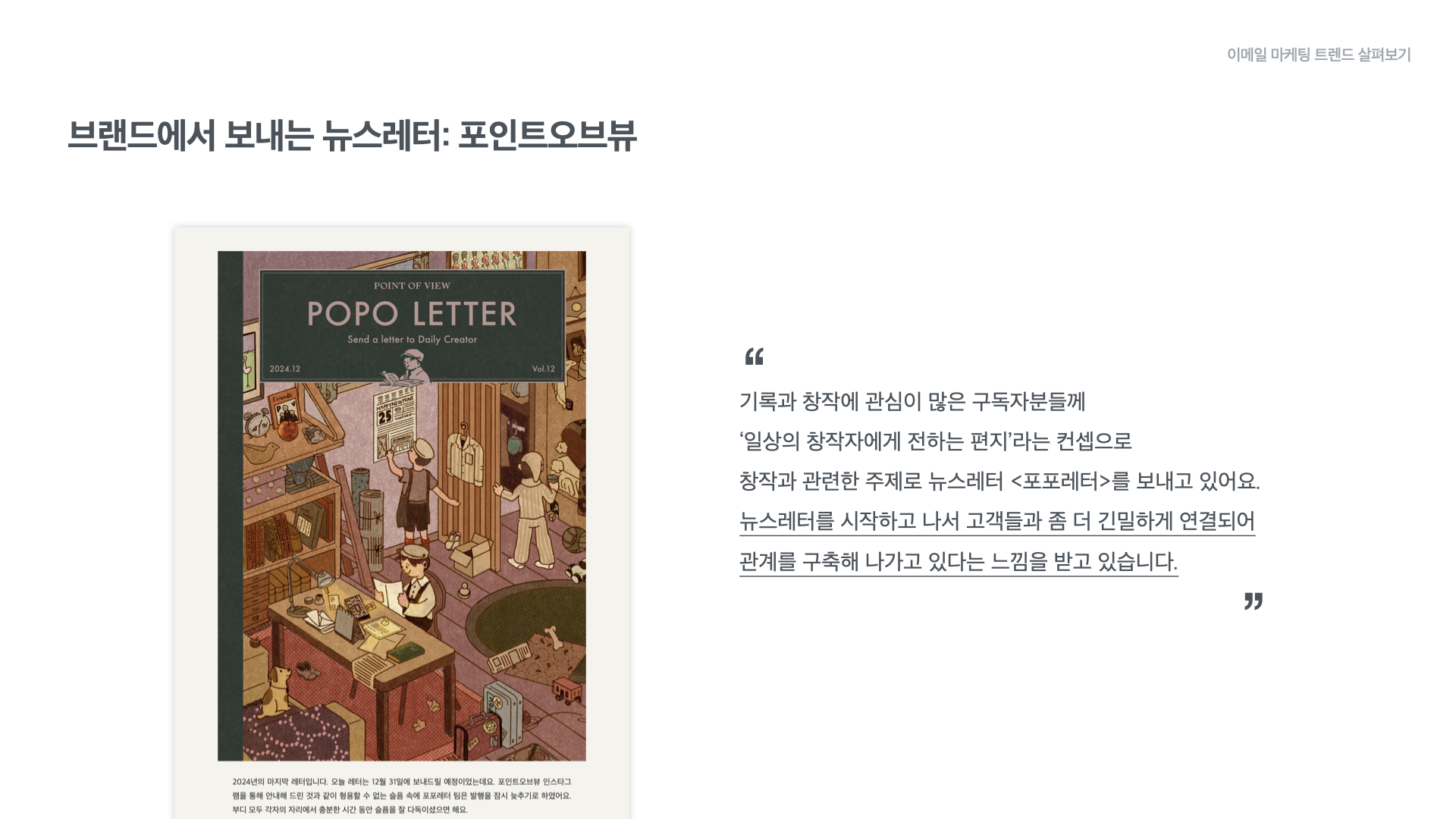 문구 큐레이션 브랜드 ‘포인트오브뷰’에서는 기록과 창작에 관심이 많은 구독자를 대상으로 ‘일상의 창작자에게 전하는 편지’라는 컨셉의 <포포레터>를 발행합니다. 매달 한 번 뉴스레터를 발행하며 고객들과 조금 더 긴밀하게 연결되고 단단한 관계를 만들고 있다는 느낌을 받고 계신다고 이야기했습니다.