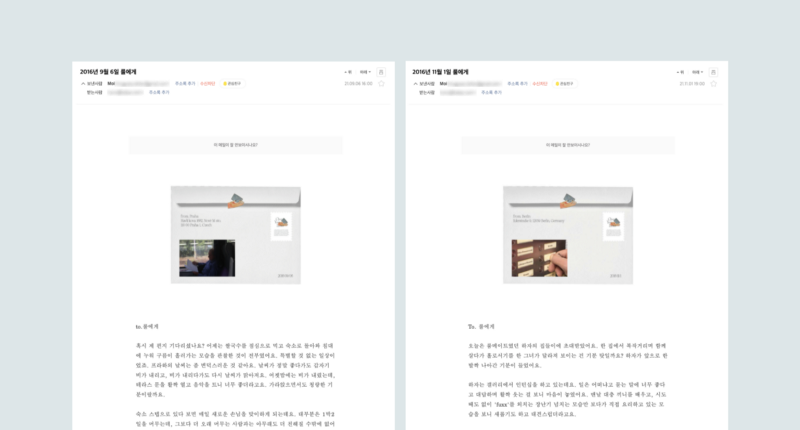 대부분 현재의 일상이나 고민을 이야기해주시는데요. 2016년도에 해외에 계셨던 구독자일 경우, 그때의 기록을 찾아서 사진과 함께 보내주시기도 해요. 구독자 분들은 왜 현재와 과거에 얽힌 자신의 이야기를 보내주시는 걸까요? 저는 사람들이 기록을 더 자주 했으면 좋겠는데, “자유 주제의 글쓰기를 해보세요”라는 요청은 어렵고 부담스럽게 느껴질 수 있다고 생각해요. 대신, “답장을 해주세요”라는 말은 조금 더 편하게 느껴지고 행동으로 이어지는 효과가 있어요.