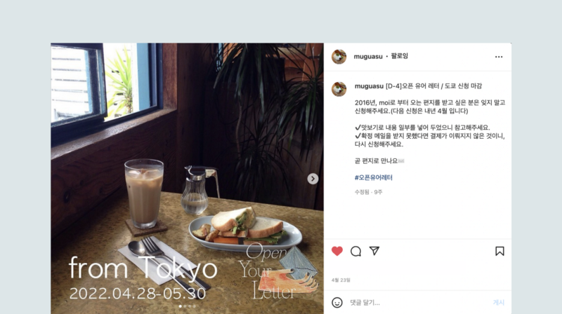 <오픈 유어 레터: 도쿄> 구독 신청 시, “2022년 4월 28일부터 2022년 5월 30일까지 발행됩니다. 다음 신청은 내년 4월입니다.”라는 안내멘트가 있더라고요. 마지막 문장이 눈길을 끌었어요.