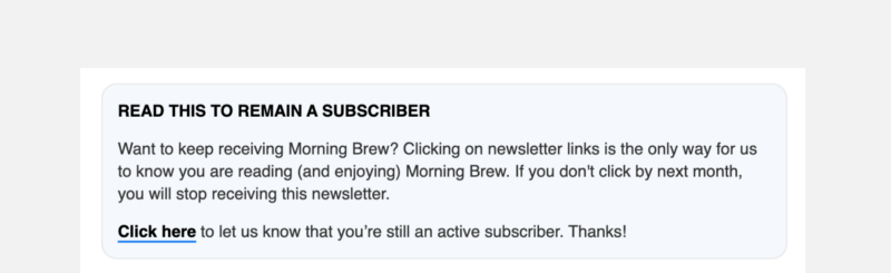 통계를 살펴보면 오픈율이 낮거나 혹은 뉴스레터 구독 후 한 번도 메일을 열어보지 않은 구독자를 발견할 수 있습니다. 이들을 대상으로 계속 뉴스레터를 받아볼 것인지 물어보는 메일을 보내보세요. <Morning Brew>가 첫 구독 후 3주간 뉴스레터를 오픈하지 않은 신규 구독자와 2달 이상 뉴스레터를 오픈하지 않은 기존 구독자를 대상으로 뉴스레터 구독을 유지할지 물어보는 메일을 보내는 것처럼 말이죠.