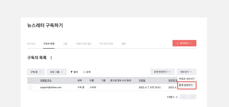오픈 통계를 활용하기 위해서는 먼저 주소록 단위의 통계를 내려받아야 합니다. 주소록에 들어가 구독자 목록 탭의 ‘통계 생성하기’를 활용하면 특정 기간에 대한 구독자들의 통계를 csv 파일로 내려받을 수 있는데요. 이를 통해 구독자의 이메일 주소를 기준으로 오픈과 관련된 수치를 확인할 수 있습니다.