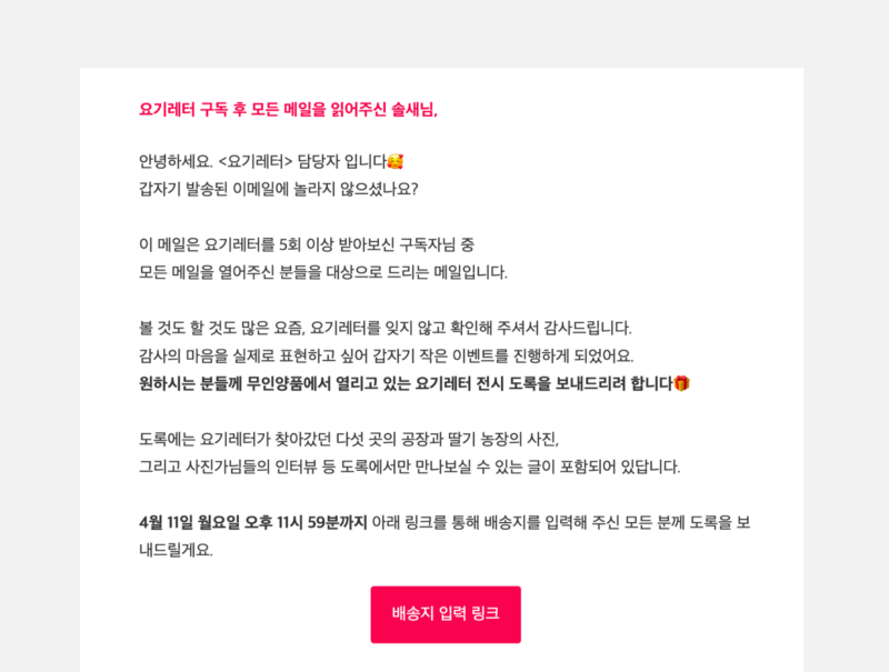 <요기레터>는 인스타그램 팔로워나 뉴스레터 전체 구독자 대신, 모든 이메일을 오픈한 구독자를 대상으로 <요기레터>의 전시 도록을 보내주는 이벤트를 진행했습니다.