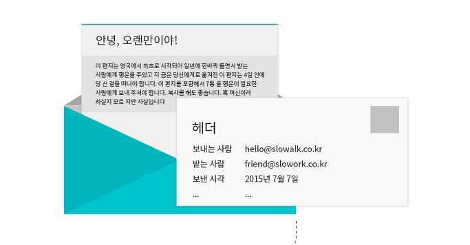 보낸 사람과 받는 사람의 정보, 보낸 시각 등 여러 가지 정보가 ‘헤더(header)’라는 곳에 저장됩니다. 실제 편지의 봉투에 해당한다고 할 수 있죠. 이 정보를 컴퓨터에 저장하고 있다가 보내기 버튼을 누르면 서버로 보내기 위한 준비를 합니다.