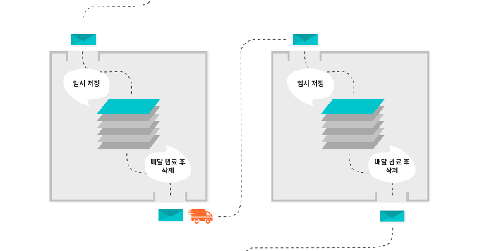 두 번째 서버는 가장 빠른 경로를 찾아 또 다른 서버로 이메일을 전달합니다. 서버들의 상태가 늘 좋을 수는 없으므로 일정 시간 간격으로 계속해서 전송 시도를 합니다. 전송을 성공하면 임시로 저장했던 메일은 삭제합니다.