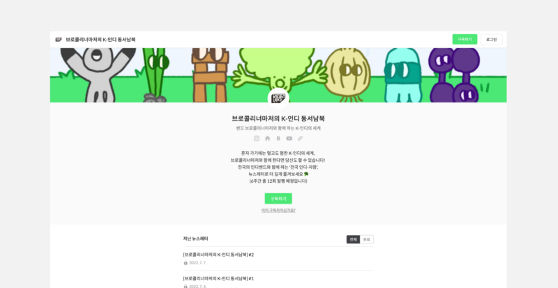 브로콜리너마저의 뉴스레터는 단독 기획공연 ‘이른열대야 2022 — 전국! 인디자랑’ 투어 기간 동안 총 12회 발행됩니다. 공연 혹은 행사를 기획하고 있다면, 무대에서 전할 수 없었던 여러 가지 이야기들을 뉴스레터로 전해 보면 어떨까요? 공연은 끝나도 뉴스레터는 언제나 메일함에 남아있을 테니까요.