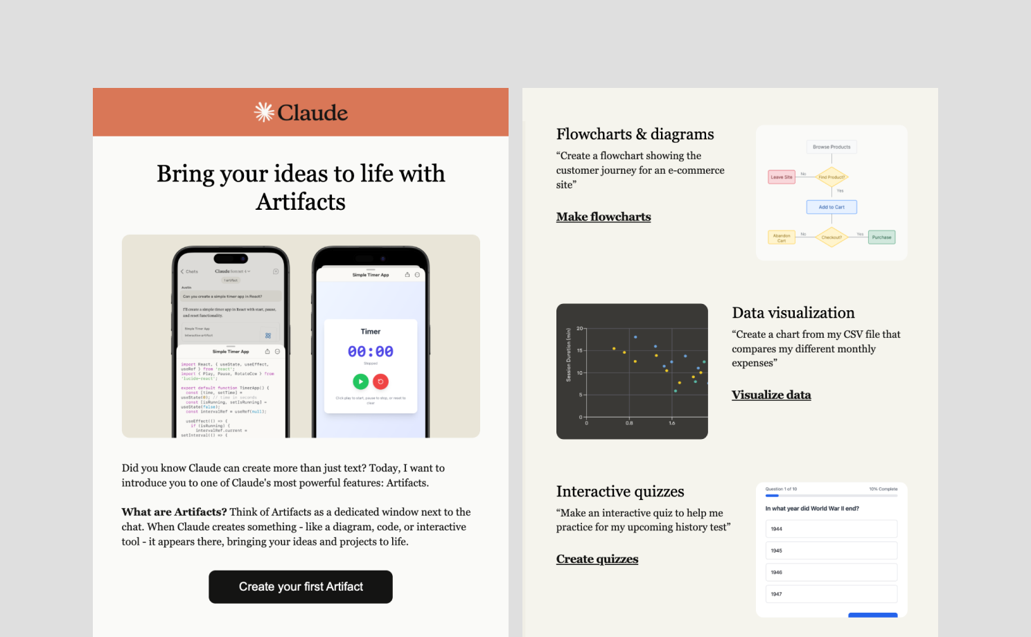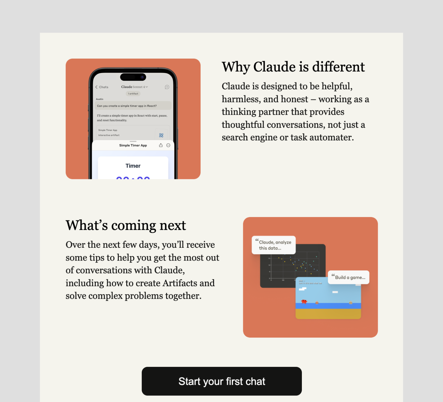 온보딩 이메일 중반을 넘어가는 단계에서 클로드는 핵심 기능인 'Artifacts'를 별도 주제로 뽑아 집중 조명합니다. 텍스트 답변 옆에 별도의 창을 띄워 차트나 코드를 시각적으로 보여주는 이 기능을 사용하면, 플로우 차트, 데이터 시각화, 앱 코딩 등 고도화된 서비스를 체험할 수 있습니다. '텍스트 프롬프트' 예시만 반복되어 지루해질 수 있는 시점에 시각적 재미를 주는 기능을 소개함으로써, 사용자의 흥미를 다시 한번 환기하고 유료 전환의 가능성까지 자연스럽게 제시합니다.
