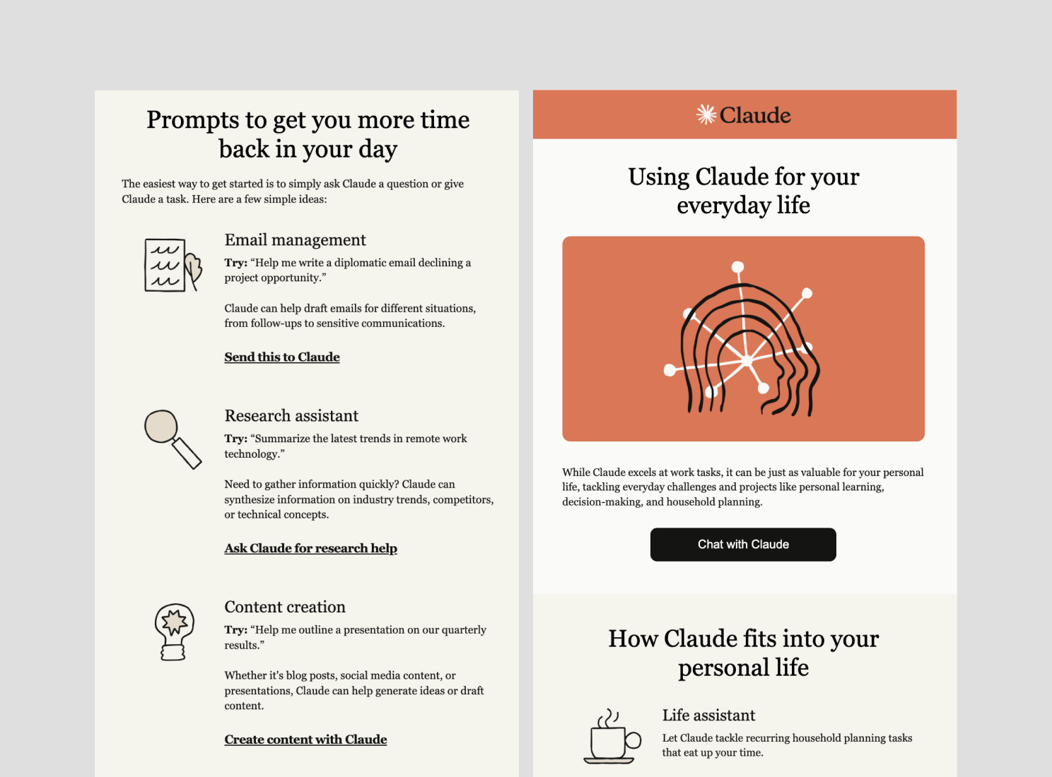 마지막 온보딩 이메일에서는 사용자의 숙련도를 한 단계 높여주는 'Power Moves' 기술을 전수합니다. 결과물을 더 캐주얼하게 만들 거나 길이를 조절하는 방법, 복잡한 문제를 해결하기 위한 프롬프트를 소개하며 클로드를 더 잘 사용할 수 있도록 돕는데요. 사용자가 우리 서비스를 더 잘 다루고 개인화된 경험을 쌓을수록, 다른 서비스로 이탈은 훨씬 어려워집니다. 클로드는 잘 설계된 온보딩 이메일로 신규 고객을 서비스 전문가로 양성하며 탄탄한 팬덤을 구축하고 있습니다.