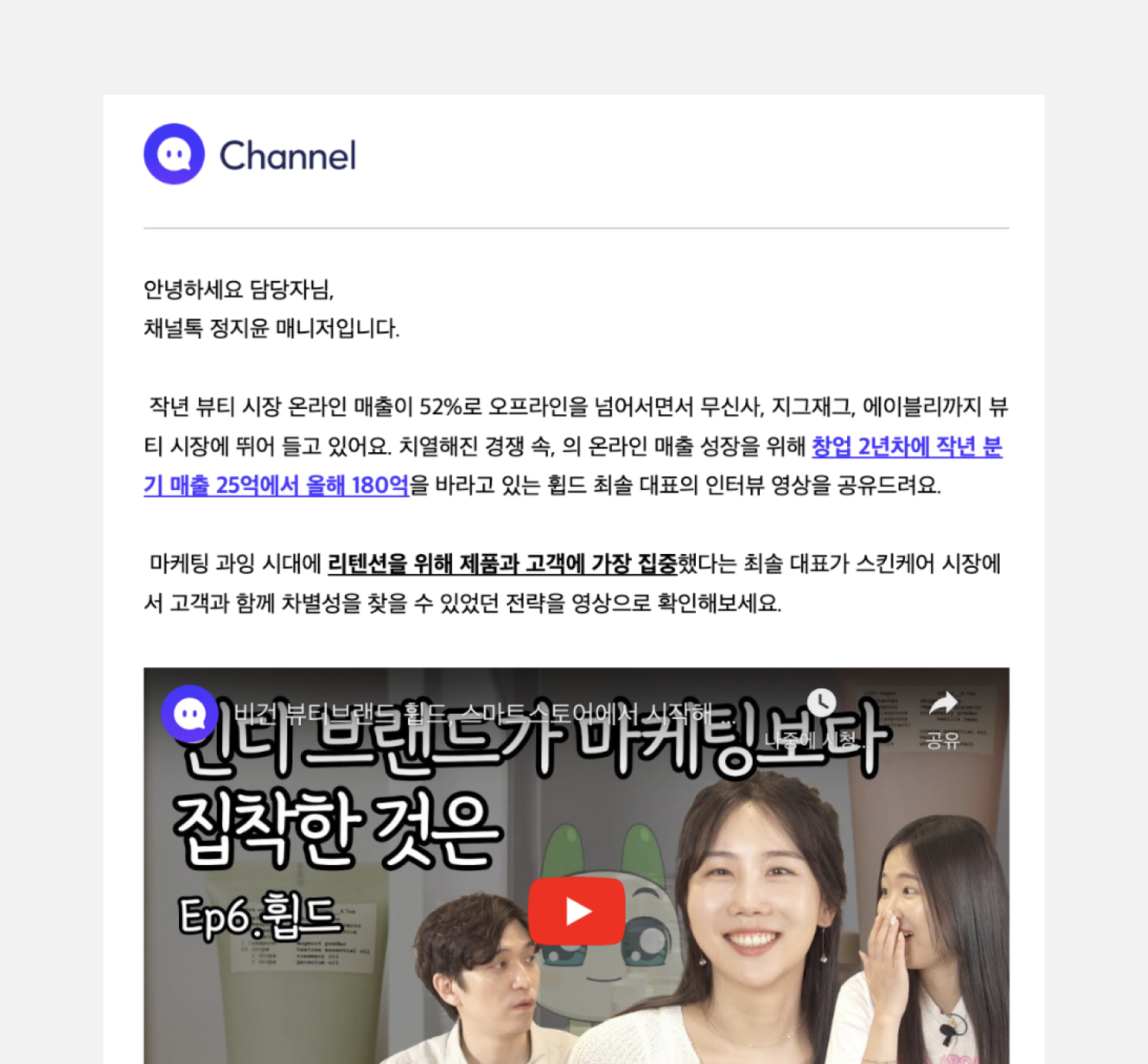 매주 1회 블로그, 영상 등 채널톡 고객의 성공 사례나 잠재 고객이 궁금해할 만한 업계 소식을 추려 이메일로 발송했어요. 가령 패션 업계라면 유통 플랫폼에 의지하지 않고 자사몰을 통해 내 고객을 직접 관리하며 건강한 비즈니스 성장을 할 수 있는 방법을 고민 할텐데요. 이런 고민을 가진 채널톡 고객사의 인터뷰 영상과 성공 전략을 메일형식으로 가공해 전달하는 것이죠. 이러한 방식의 콜드 메일은 잠재 고객의 고민을 해결할 힌트를 제공하고 더 자세한 솔루션이 궁금한 사람이 채널톡에 직접 컨택할 수 있는 창구 역할을 해요.