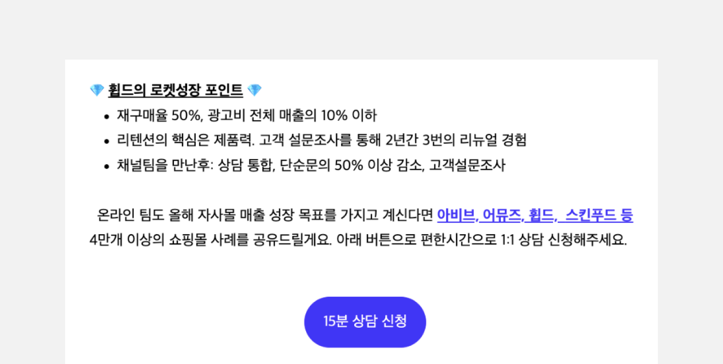 콘텐츠 뒤의 흐름도 넛지를 활용해 미팅으로 자연스럽게 이어지도록 설계했어요. 콜드 메일을 통해 채널톡에 관심을 가지게 된 사람이 부담 없이 상담을 신청할 수 있도록 이메일 하단에 15분 - 30분 정도의 짧은 미팅이나 티타임 스케줄을 잡을 수 있는 CTA 버튼을 구성에 포함하는 방식으로요.