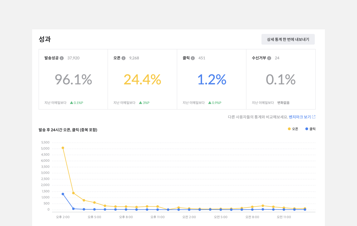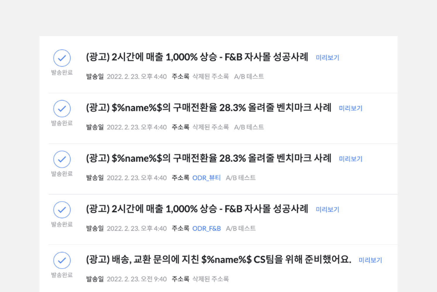 또 제목 A/B 테스트를 통해 업계별 가장 잘 통하는 제목 형식과 키워드를 찾아갔고, 클릭 성과를 보면서 잠재 고객들이 궁금해하는 콘텐츠와 주제들을 파악했더니 나중에는 이메일 수신인이 대표인지 실무자인지, 실무자라면 어떤 팀들이 대표 메일을 주로 관리하는지 비즈니스 규모별로 짐작이 되더라고요.