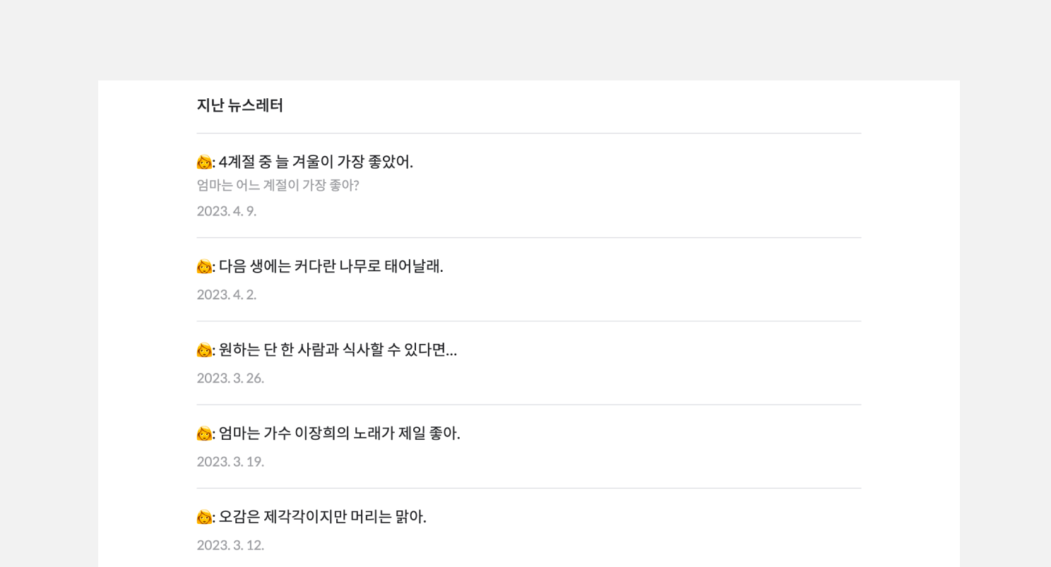 36살 띠동갑 엄마와 딸이 주고받는 이야기가 담긴 <엄마의 편지>입니다. 뉴스레터 한 편에 딸의 질문과 엄마의 답변, 그리고 그에 대한 딸의 답장이 담겨있는데요. 오고 가는 편지 속에서 딸과 엄마의 관계뿐만 아니라 한 개인으로서의 엄마의 이야기 또한 살펴볼 수 있습니다.