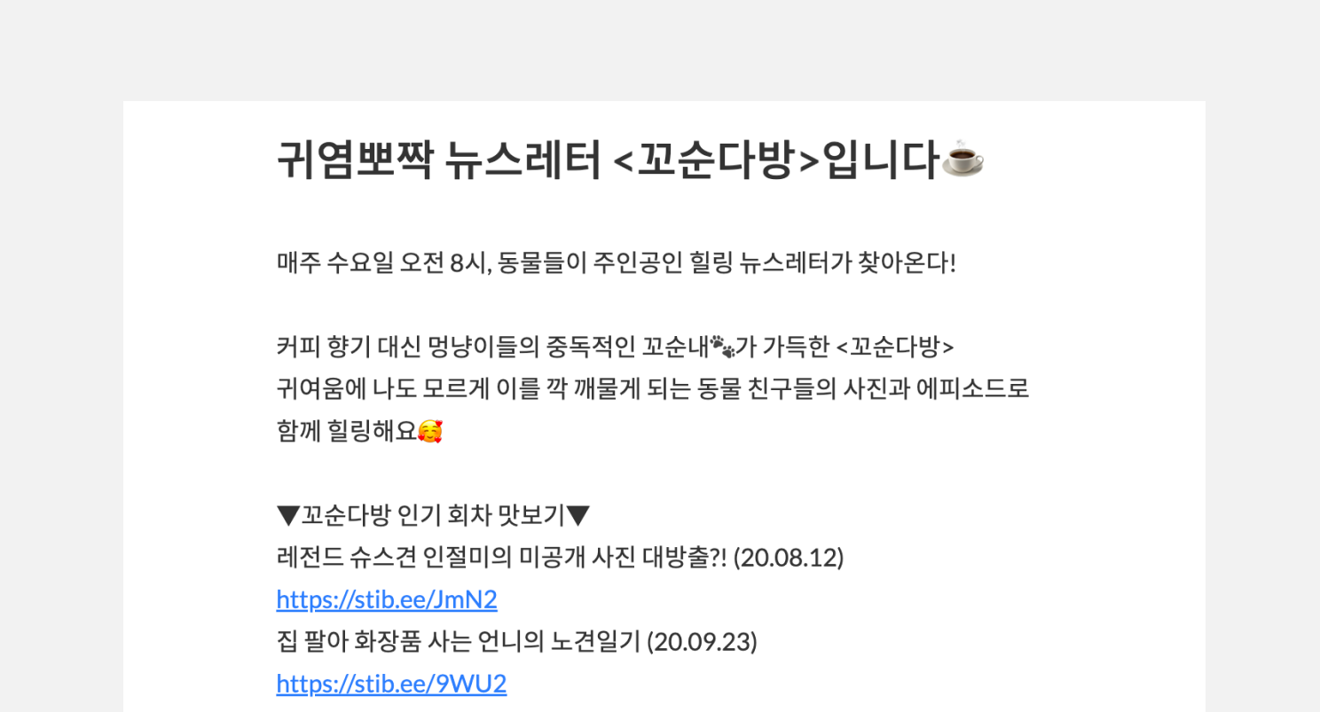 <꼬순다방>은 몇 가지 링크를 구독 폼에 삽입해 두었습니다. 바로 구독자들에게 많은 사랑을 받은 뉴스레터와 아카이브의 링크인데요. 구독을 고민하는 예비 구독자가 뉴스레터의 내용을 확인할 수 있도록 하면서 구독 후 첫 뉴스레터를 받을 때까지 지난 뉴스레터를 읽을 수 있도록 돕는 것입니다.