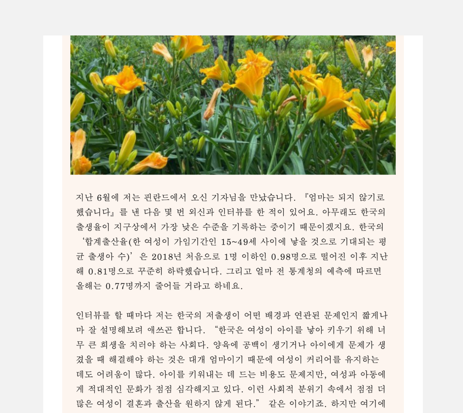 <엄마의 편지> 뉴스레터의 제목에는 한 가지 특징이 있습니다. 바로 '👩:'로 시작해 제목이 마치 '엄마의 말'처럼 느껴진다는 것인데요. 이렇게 뉴스레터 제목을 패턴화하면 구독자들은 수많은 메일이 쌓인 메일함에서도 나의 뉴스레터를 쉽게 발견하고 인지할 수 있다는 장점이 있습니다. 내 뉴스레터만의 시그니처를 만드는 것이죠.