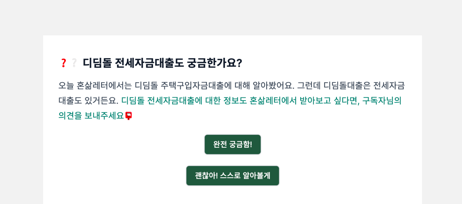 <혼삶레터>는 매주 피드백 버튼의 문구를 변경하거나, 이미지와 같이 뉴스레터에서 다룬 내용을 활용해 두 가지 버튼 중 한 가지 선택지에 대한 의견을 듣는 등의 방식으로 피드백을 받습니다. 더 많은 피드백을 받고 싶다면, <혼삶레터>와 같이 다양한 피드백 방식을 테스트해 보세요. 우리 구독자에게 잘 맞는 방법을 찾을 수 있을지 모릅니다.