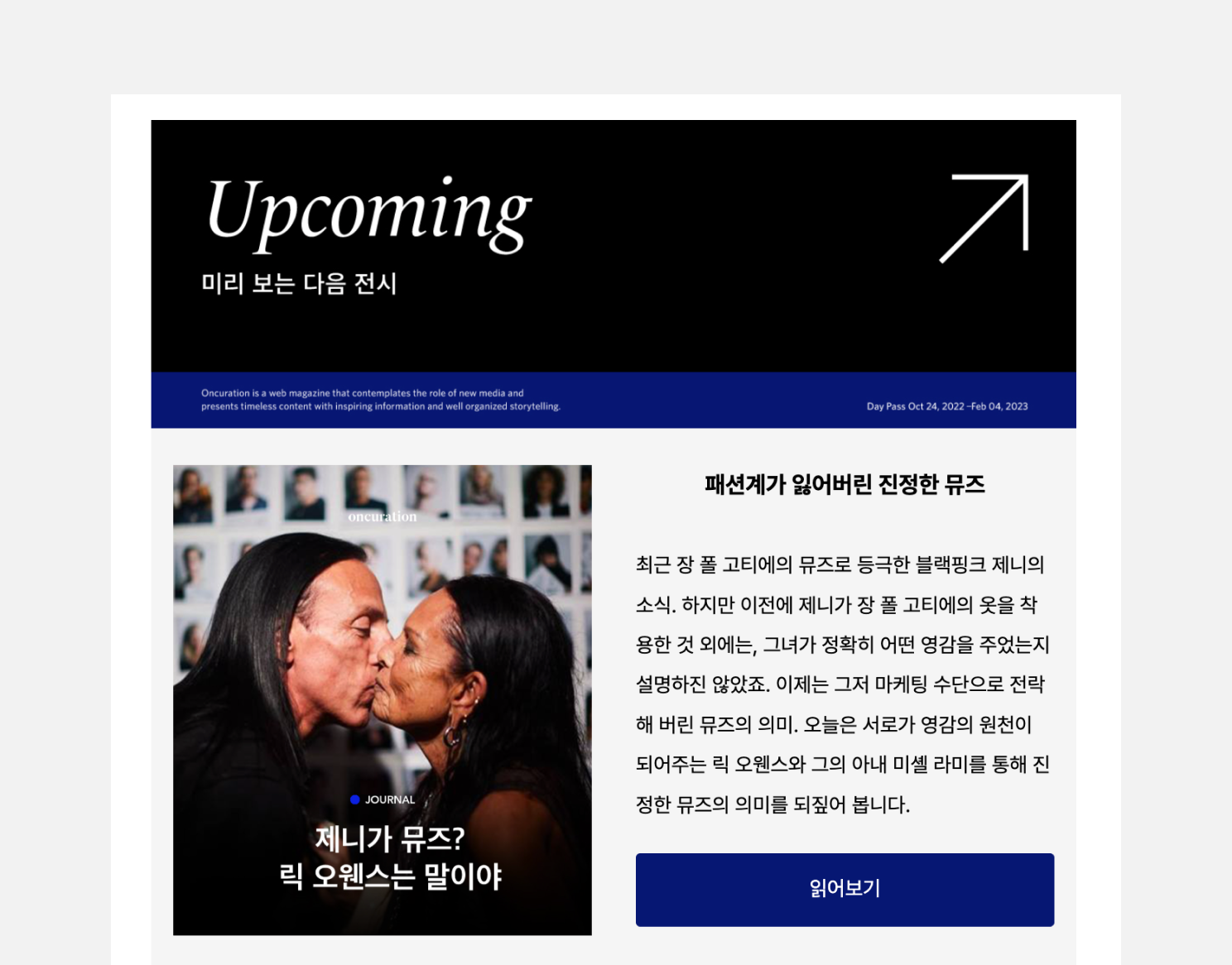 패션과 라이프스타일 분야의 변화를 새로운 시각으로 해석하고 새로운 담론을 제안하는 뉴스레터 <온큐레이션>입니다. 웹사이트에 발행된 아티클을 ‘전시’라는 개념으로 풀어내며, ‘미리 보는 다음 전시’, ‘지난 전시 뒷이야기’ 등의 코너로 뉴스레터를 구성합니다.