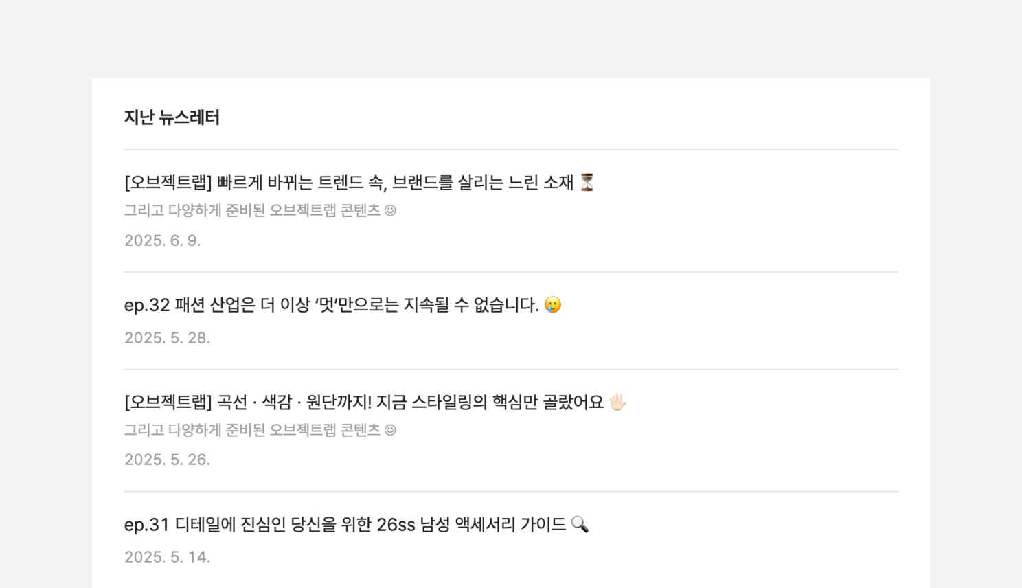 전하고 싶은 이야기가 많은 브랜드일수록 <Object Lab>처럼 발행 요일과 주차에 따라 코너를 구분하는 방식이 유용합니다. 하나의 콘텐츠에 제품 소개, 트렌드 분석, 전시 소식까지 모두 담기면 구독자가 핵심을 놓치기 쉽기 때문인데요. <Object Lab>은 콘텐츠의 목적과 성격을 기준으로 코너를 분리하여 각 정보를 효과적인 방식으로 전달하고 있습니다.