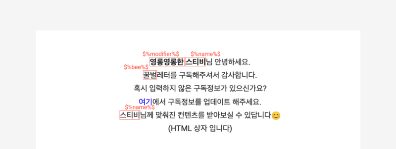 스티비에서는 메일 머지 기능을 제공하고 있습니다. 스티비에서 사용하는 메일 머지 태그는 $%field%$ 형식인데요. 여기에 사용하고자 하는 필드 키만 입력해주면 HTML 상자와 HTML 작성하기에서도 쉽게 사용할 수 있습니다!