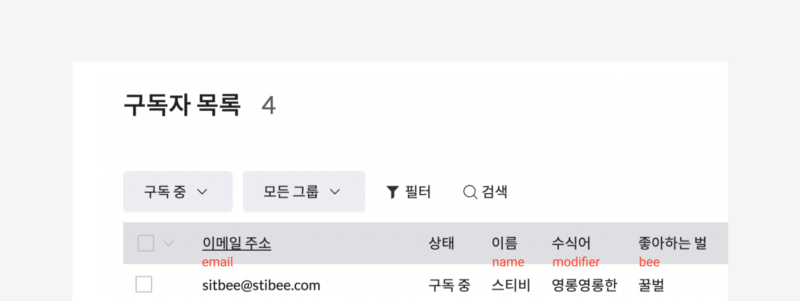 메일 머지와 HTML 상자를 통해 간단한 콘텐츠를 작성해보겠습니다. 사용자 정의 필드 4가지 이메일 주소(email), 이름(name), 수식어(modifier), 좋아하는 벌(bee) 값이 입력된 아래 주소록을 예시로 사용해 봅시다.