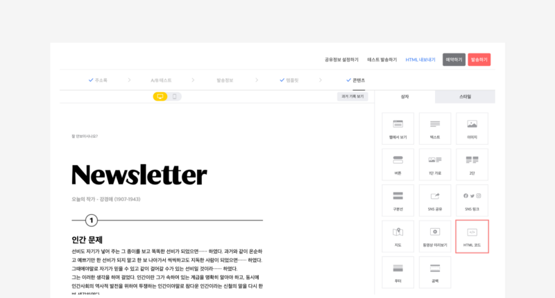 걱정하지 마세요. 스티비가 있잖아요!✌️ 스티비에서는 코드를 전혀 모르는 사용자도 드래그 앤드 드롭 방식으로 콘텐츠 상자를 추가하여 손쉽게 뉴스레터를 제작할 수 있는 위지윅² 에디터를 제공하고 있습니다. 이에 더해, 일부분만 코드로 커스텀 하고 싶은 사용자를 위해 스탠다드 요금제에서 HTML 상자 기능을 오픈을 앞두고 있는데요.