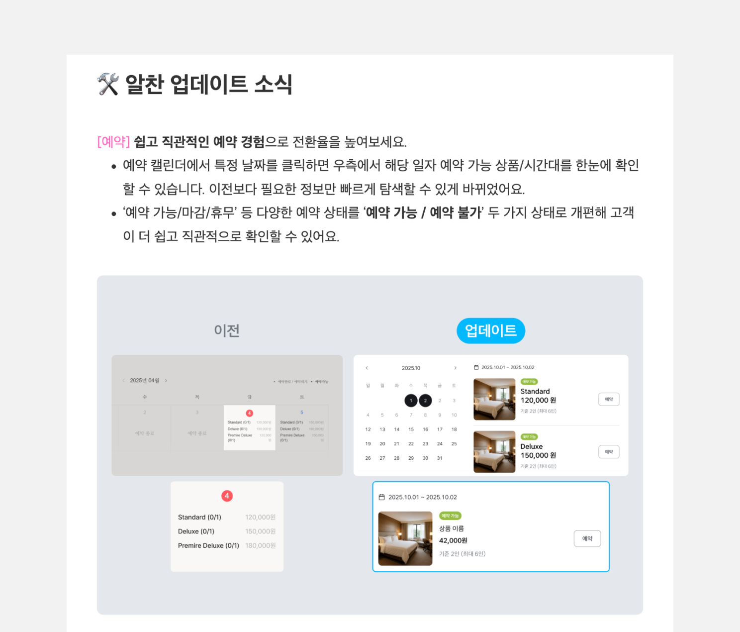 아임웹의 사례처럼 추가된 기능과 사용성을 개선한 내용을 정리해 업데이트 소식을 전하면, 고객이 새로운 기능을 잘 인지하고 사용할 수 있도록 도울 수 있습니다. 더불어 고객의 제품 관여도를 높여 자연스럽게 리텐션을 높이는 것도 가능합니다.