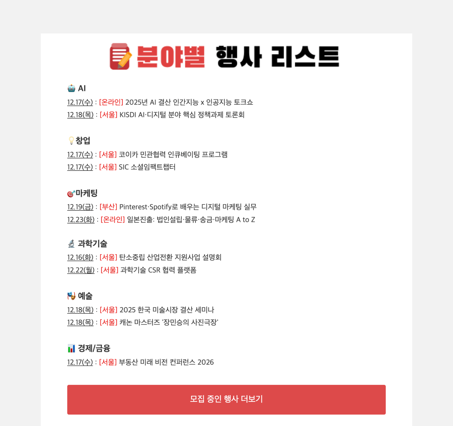 행사 플랫폼 이벤터스는 분야별 행사 소식과 모임을 모아 매주 월요일 뉴스레터로 발송합니다. 이렇게 서비스와 관련된 유용한 콘텐츠를 지속적으로 발송하면 고객과 잠재 고객은 뉴스레터가 주는 도움을 서비스에 대한 신뢰로 확장하게 됩니다. 신뢰가 쌓이면 이후 서비스 소개나 업데이트 같은 광고성 정보를 보낼 때도 거부감을 줄어듭니다. 많은 광고비를 투자하지 않고도 서비스를 알릴 수 있는 채널을 확보할 수 있습니다.