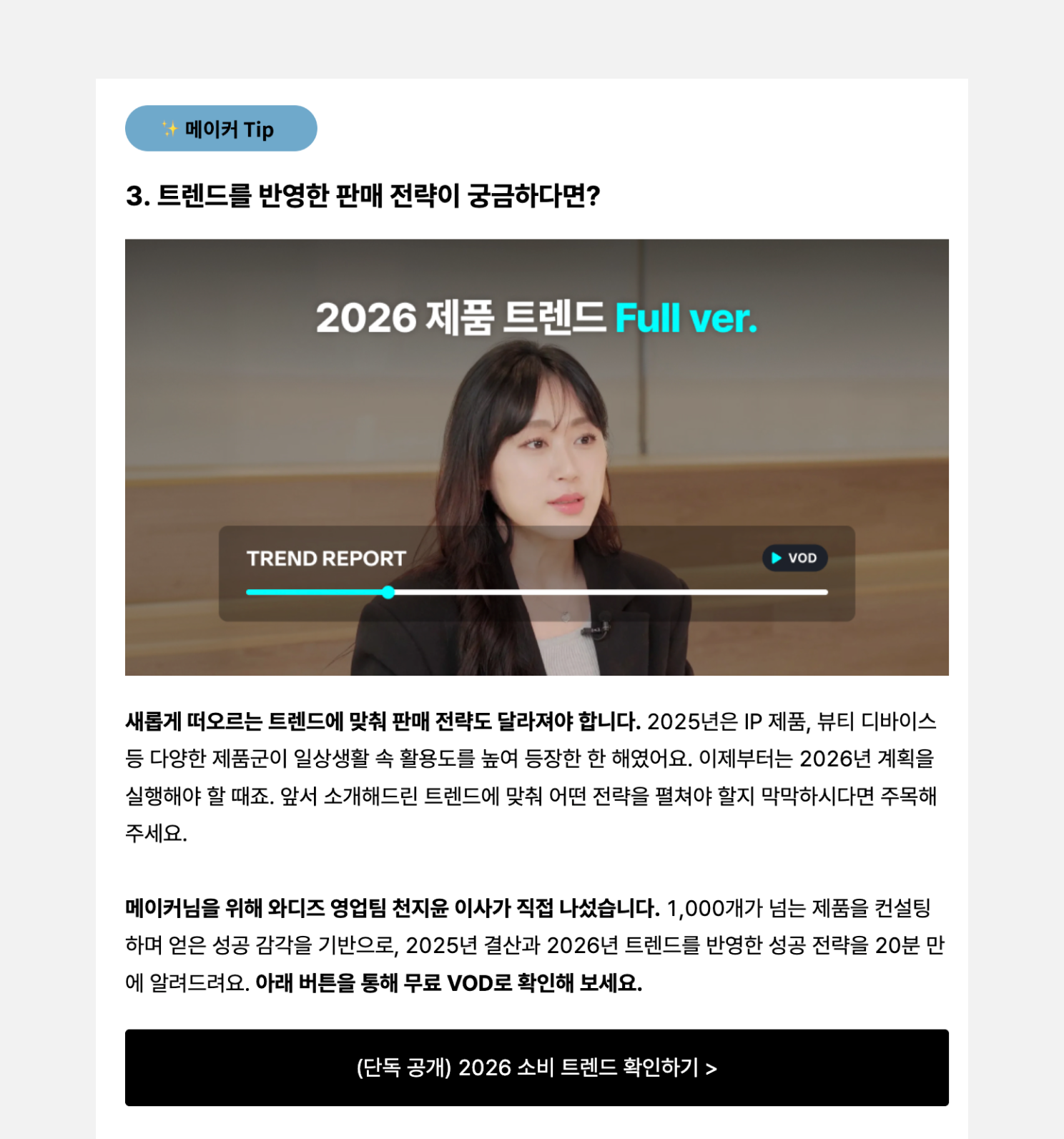 기존 콘텐츠를 뉴스레터에 활용하는 가장 쉬운 방법은 와디즈의 사례와 같이 핵심 내용만 발췌한 뒤 CTA로 전체 콘텐츠를 확인할 수 있도록 유도하는 것입니다. 이렇게 하면 뉴스레터 발행에 별도로 드는 시간을 줄여 꾸준한 발행이 가능하고 자연스럽게 원본 콘텐츠 트래픽 증가에도 도움이 됩니다. 뉴스레터와 블로그, 유튜브 등의 채널을 독립적으로 운영하지 않고 서로를 보완하는 채널로 활용할 수 있습니다.